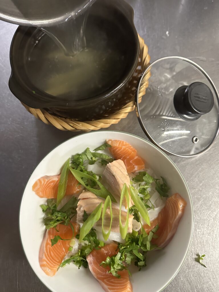 Pho z łososiem to kreatywna wariacja na temat tradycyjnego pho, łącząca miękki makaron ryżowy, lekki i słodki bulion (zazwyczaj gotowany na wolnym ogniu z ośćmi łososia) oraz plastry świeżego łososia, tworząc niepowtarzalny, pyszny.